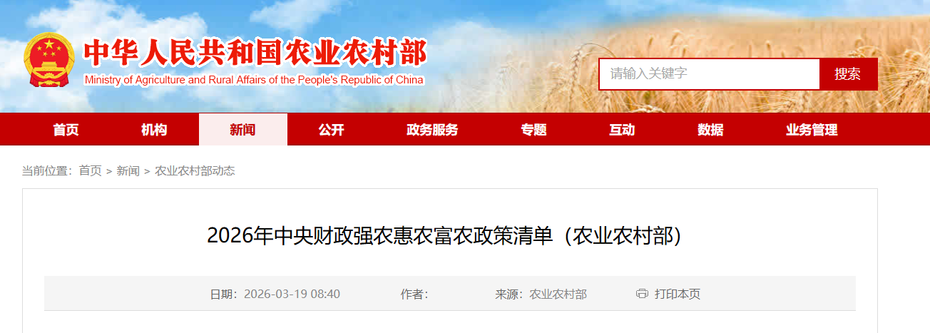 2026年中央财政强农惠农富农政策清单(农业农村部