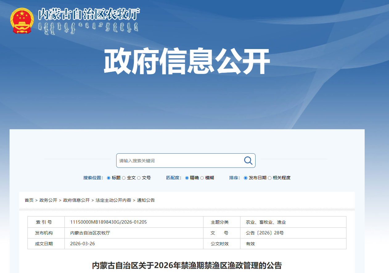内蒙古自治区关于2026年禁渔期禁渔区渔政管理的公告