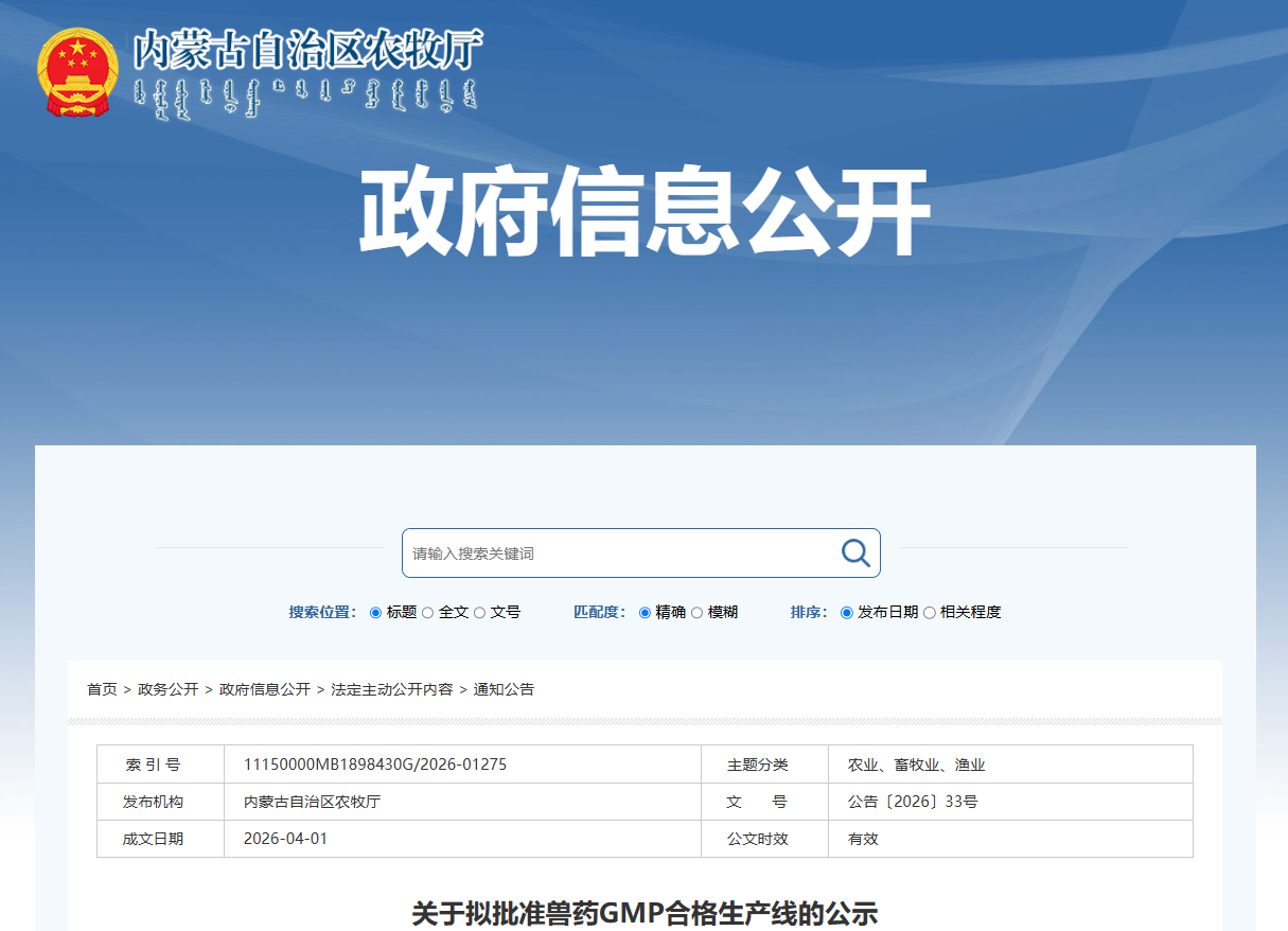 关于拟批准兽药GMP合格生产线的公示