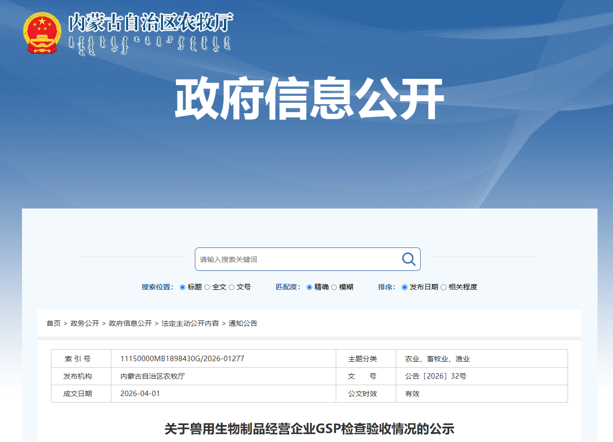 关于兽用生物制品经营企业GSP检查验收情况的公示